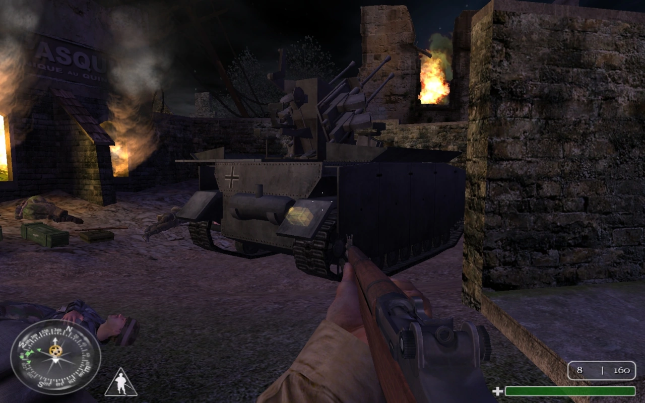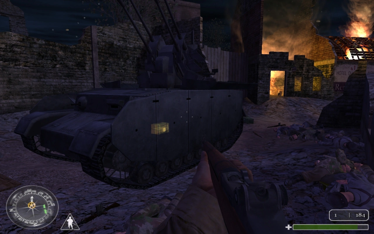 Муди садится за руль, Элдер сидит на заднем сидении, а Мартин на переднем. Последние двое отстреливаются от атакующих немцев, которые преследуют героев на машинах и мотоциклах. Они чуть не врезаются в немецкую колонну машин. Вскоре они заезжают в деревню, где им придется пройти небольшое расстояние пешком, так как танк преградил дорогу. Найдя другую машину, бойцы решают сесть в нее. Пока Муди и Элдер пытаются завести машину, Мартин прикрывает их. Машина вскоре заводится, и небольшой отряд продолжает путь. В этот раз за рулем Элдер, на переднем сидении Муди, а на заднем Мартин. В конце концов, после небольшого боя, группа приезжает в штаб и вызывает подкрепление.