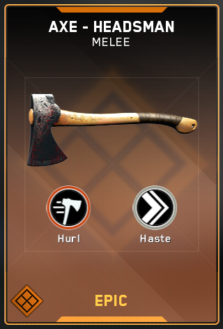 Unlike most weapons in the game, the Axe only has one variant, the Epic Headsman, which allows the player to throw the Axe and pick it up from the ground once thrown.