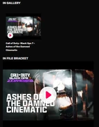 Videos uploaded to the wiki follow the same concept as images, however, shouldn't regularly be used within link brackets, [[File:Call of Duty- Black Ops 7 - Ashes of the Damned Cinematic]], and instead be used within a gallery.