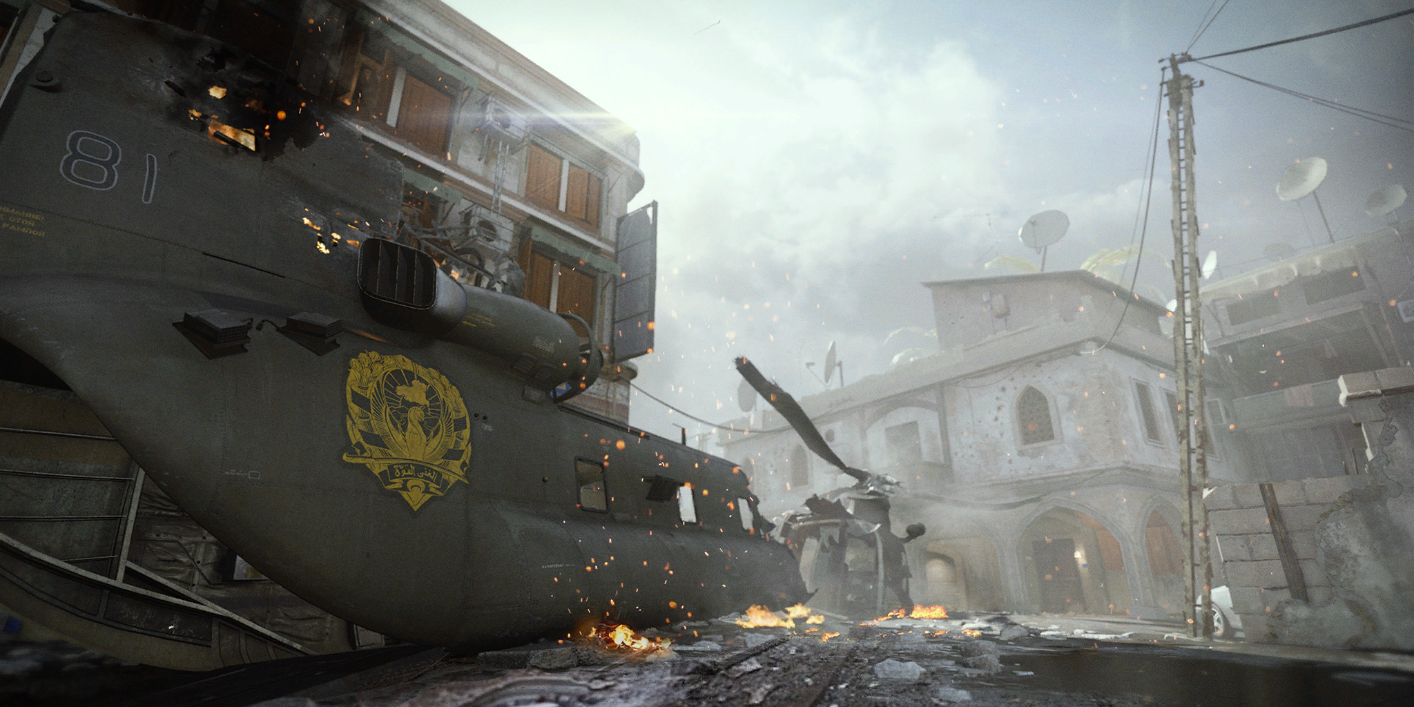 In the top floor of the building behind the crashed helicopter the player can see a photo on the wall, showing two people on camels, dressed in Arab attire. These are actually employees from Infinity Ward, during their research trip in Egypt for Call of Duty 2. The man in the front is Grant Collier, former president of Infinity Ward.