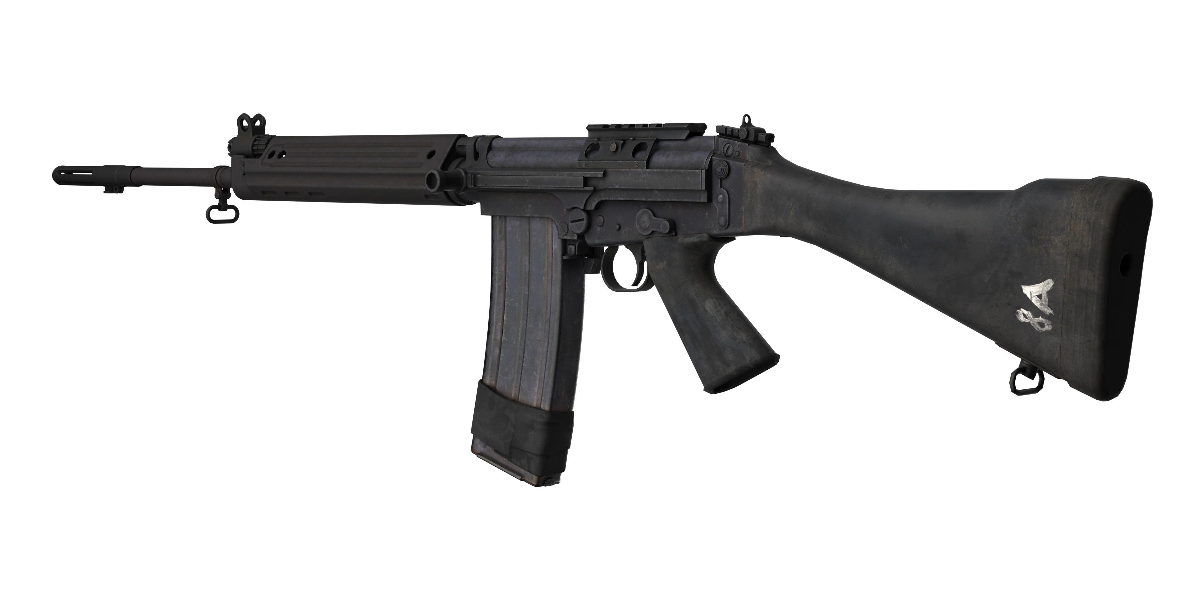 - The FAL's handguard appears to have a discoloration or a stain on it.