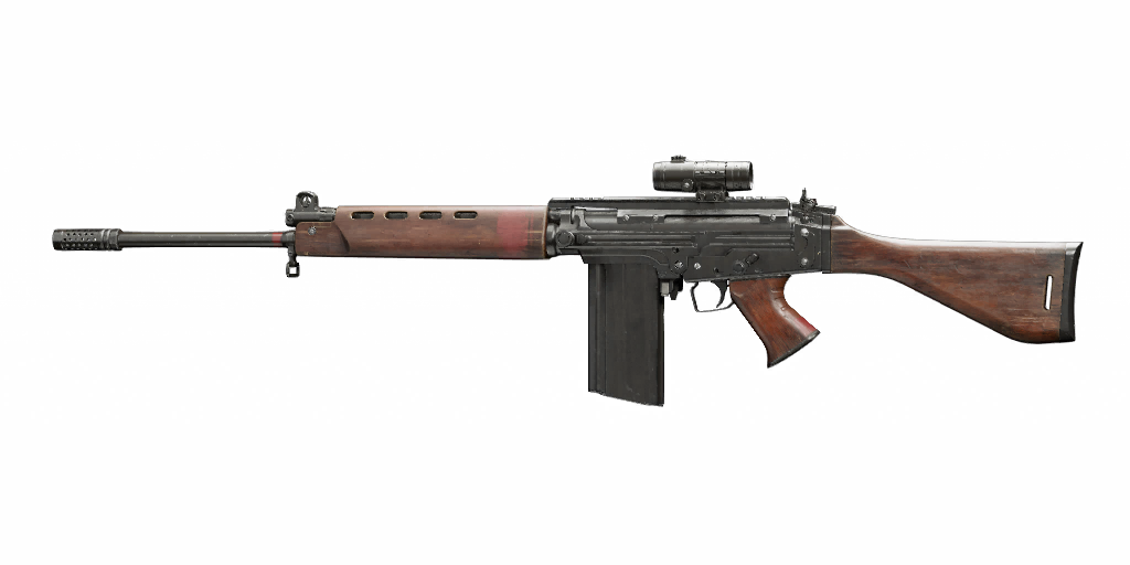 The FAL has the standard assortment of assault rifle attachments on offer. As previously mentioned, the Holographic Sight increases the FAL's minimum damage in addition to its main function as a sight attachment. The Red Dot Sight on the FAL is misaligned. All other attachments work as expected.
