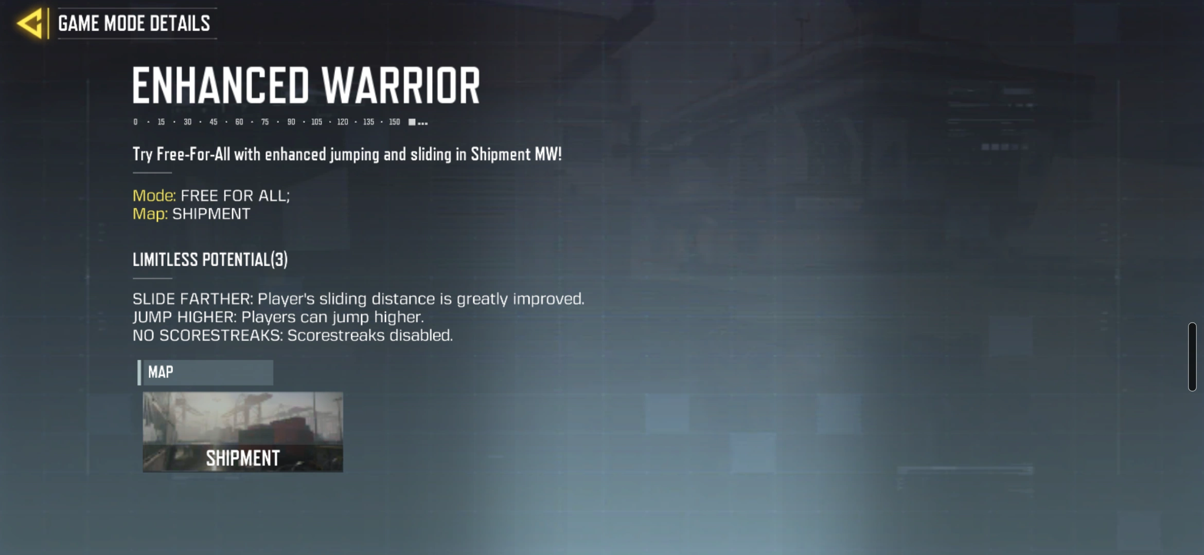 Featured in Call of Duty: Mobile, Enhanced Warrior takes place on the Modern Warfare version of Shipment, and allows the player to slide further, jump higher and restricts access to all Scorestreaks.