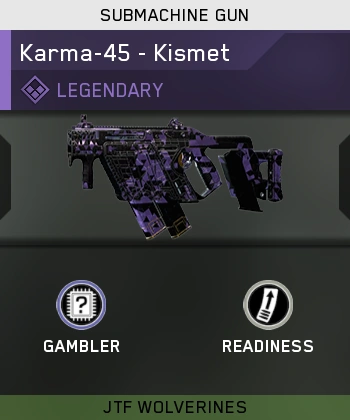 The Karma-45 is unlocked at level 9; it is the third submachine gun to be unlocked. The Karma-45 is fitted with its own sight featuring an orange reticle on a yellow tinted lens. Its built-in dual magazine means that only one magazine needs to be changed if the player has fired half or less than half of the 42-round capacity; otherwise both will be changed, while loading one at a time.