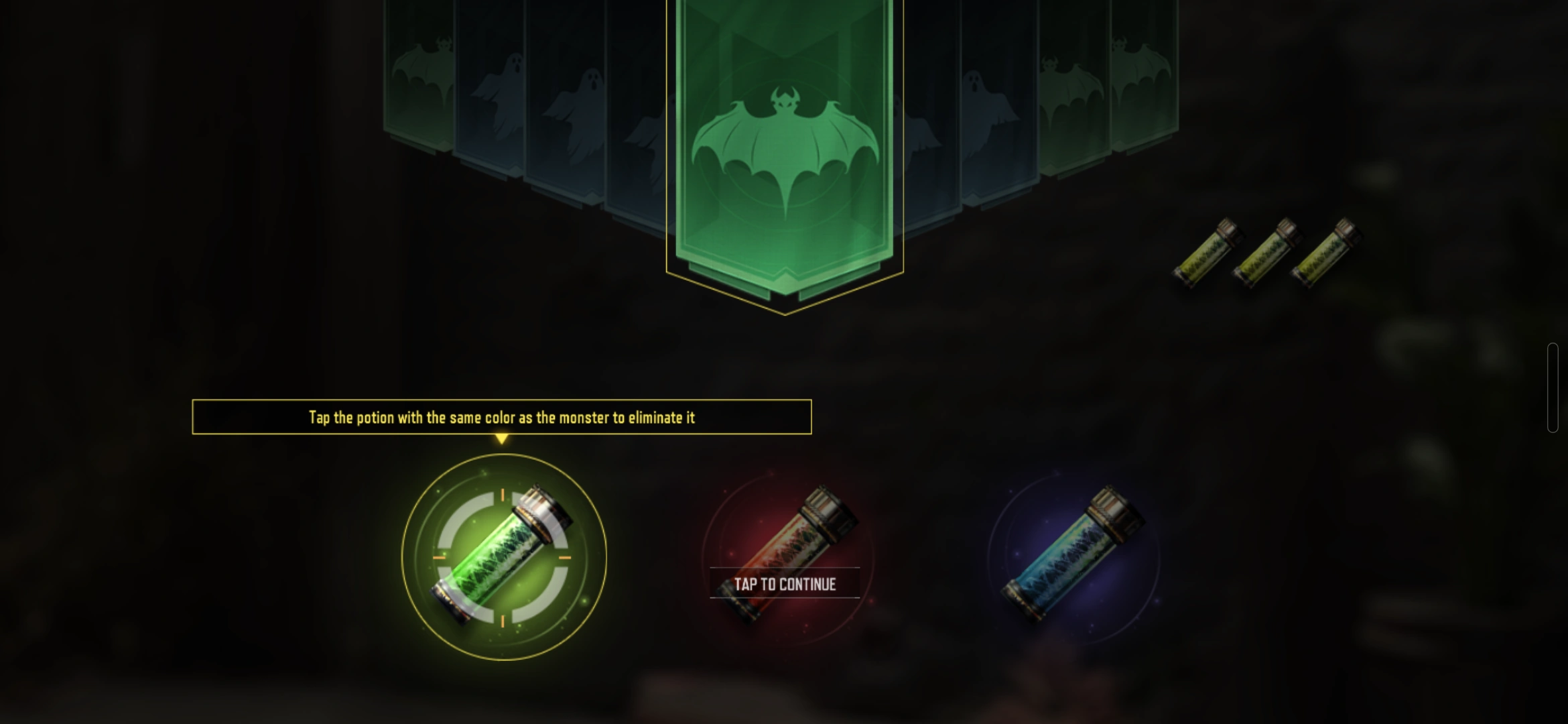 After obtaining candy, players must consume 3 pieces to activate the challenge section. Here, players are tasked with matching the colored vials to the appropriate colored monster. By matching successfully, the player will begin to earn the rewards.