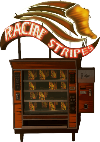 Racin' Stripes appears as a small golden brown vending machine. Racin' Stripes candy can be seen in the window to the machine. There is a very distinct golden shoe that appears on top of the machine, coupled with four brown stripes to the left of the shoe. Upon the front of the machine is the text "Racin' Stripes" curved along a wavy piece of the machine. There is a coin inserting compartment to the right side of the machine.