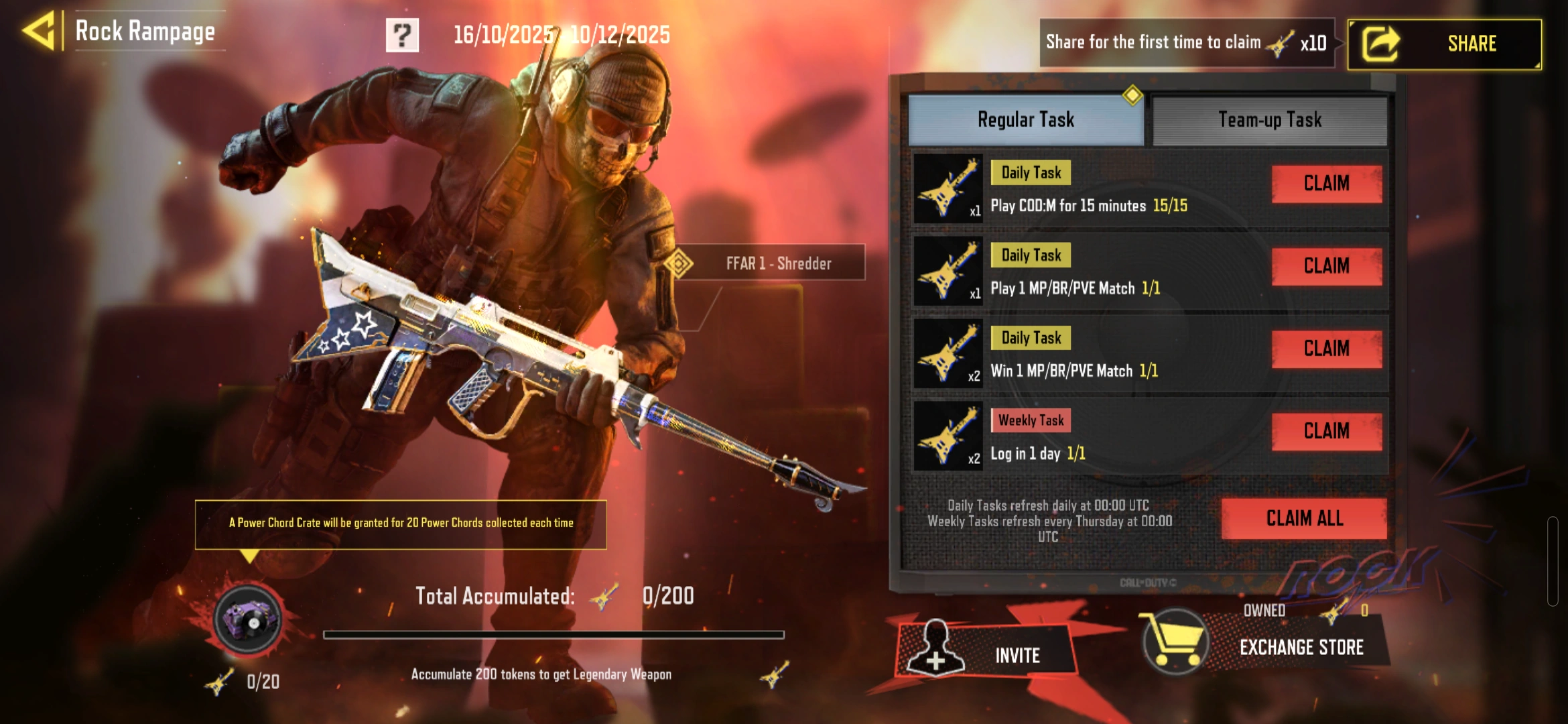 Players had to complete tasks to earn Power Chords which could be exchanged for various rewards. Every 20 Power Chords earned during the event, players would receive a Power Chord Crate. By earning 200 Power Chords, the player would receive the Legendary "Shredder" skin for the FFAR 1.