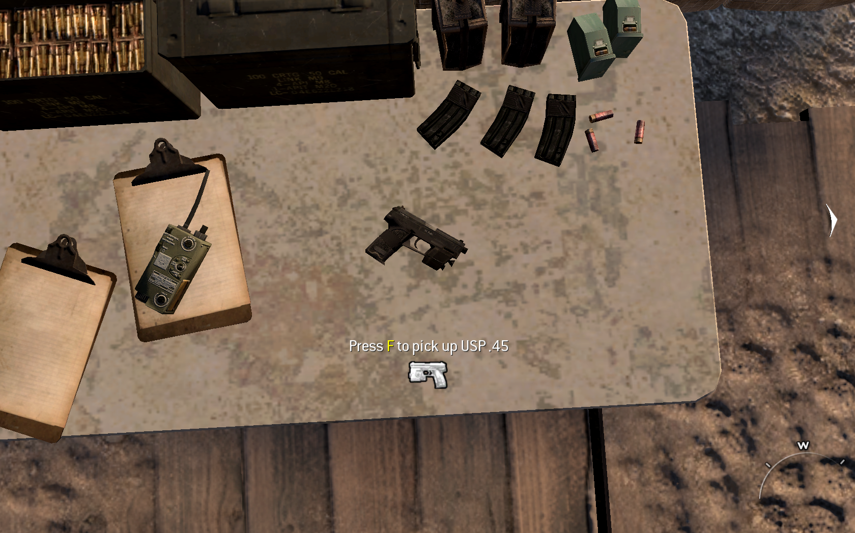 - Using noclip to get outside the map the player will find two USP .45s on a table that can be picked up and will never go under 60 reserve ammo.