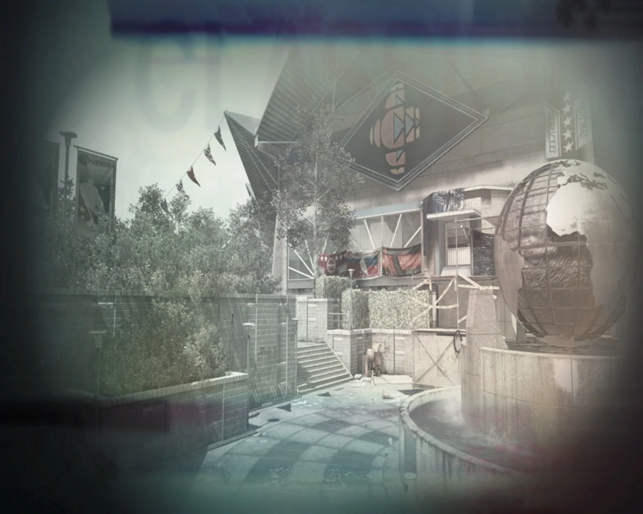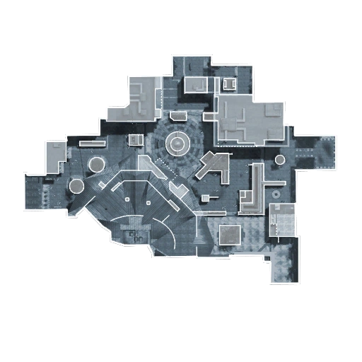 The map is very tight and includes many close corners but also has wide open spaces, including the stadium itself, the fountain located outside, and the area behind one of the buildings. Most of the combat takes place near the fountain, on the scaffolding, and inside the stadium. There is also a shop that sells various items such as magazines.