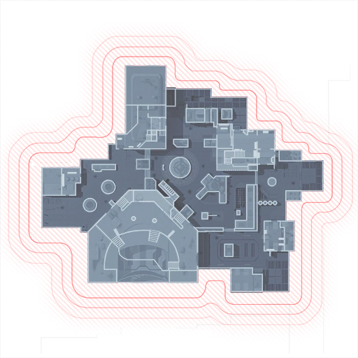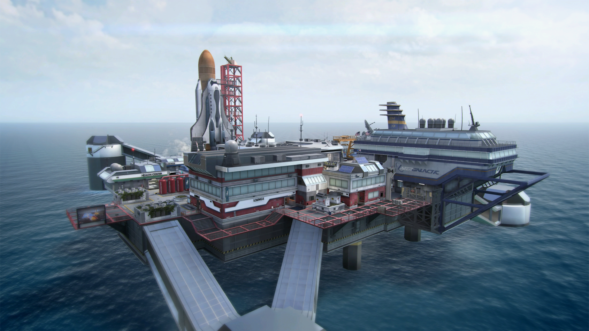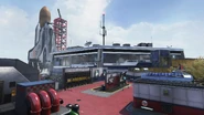 The map centers around a launch site for the space tourism company "InterGalactic". Players fight through administrative and customer welcome buildings, with all buildings roughly around the circular fountain in the centre of the map, which is easily identifiable from its rotating sculpture of the earth and moon.