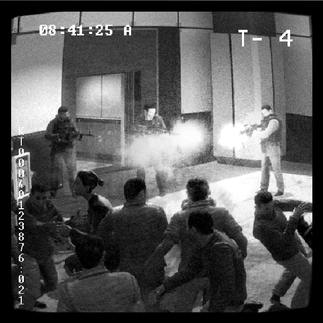 Security camera footage of Makarov's team shooting into a crowd of civilians at Zakhaev International Airport. Allen is not shown.