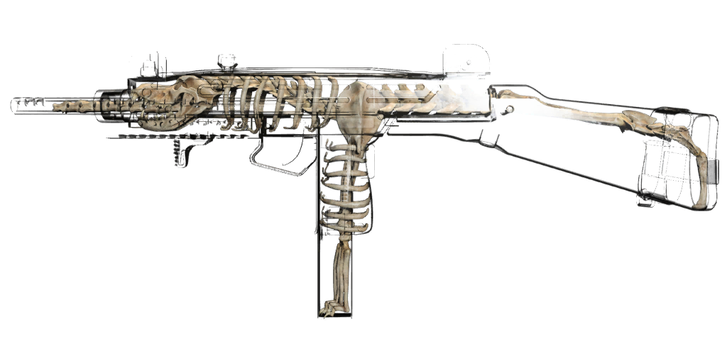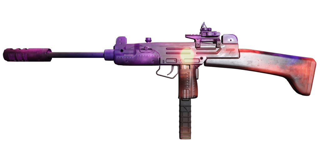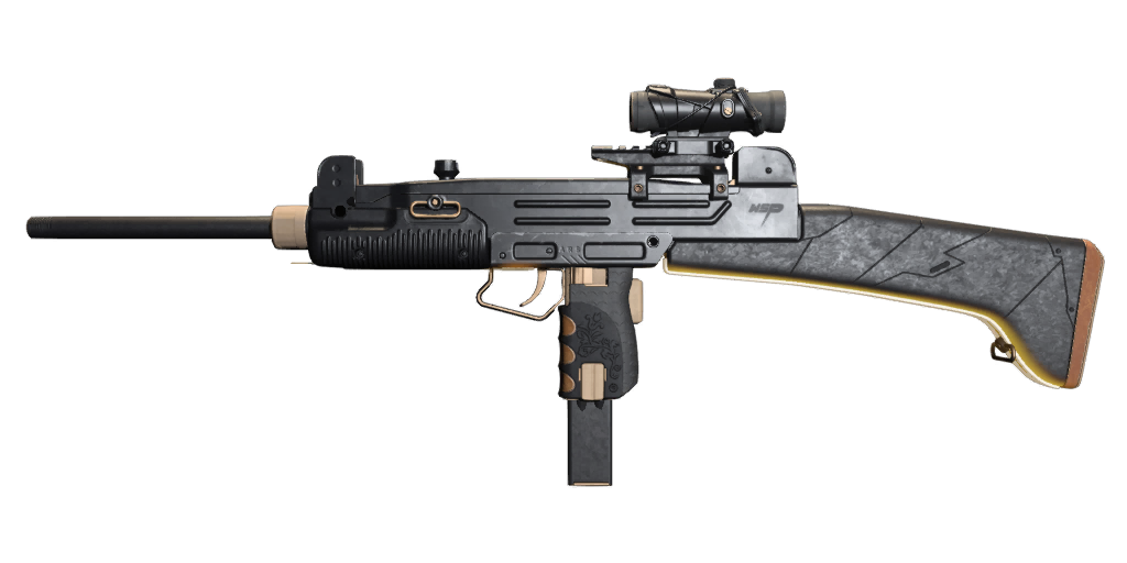 - "Fully automatic open bolt submachine gun. Simple, steady, effective."