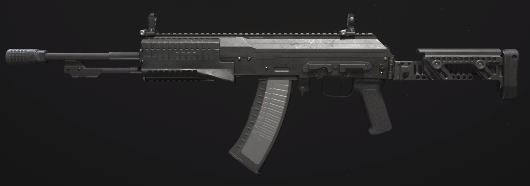 Markings that say "СДЕЛАНО В КАСТОВИИ" (Made in Kastovia) can be seen just below the iron sights, on the left side of the weapon. This contrasts the description of the AN-94 in the Gunsmith preview, which states it to be of Russian origin.